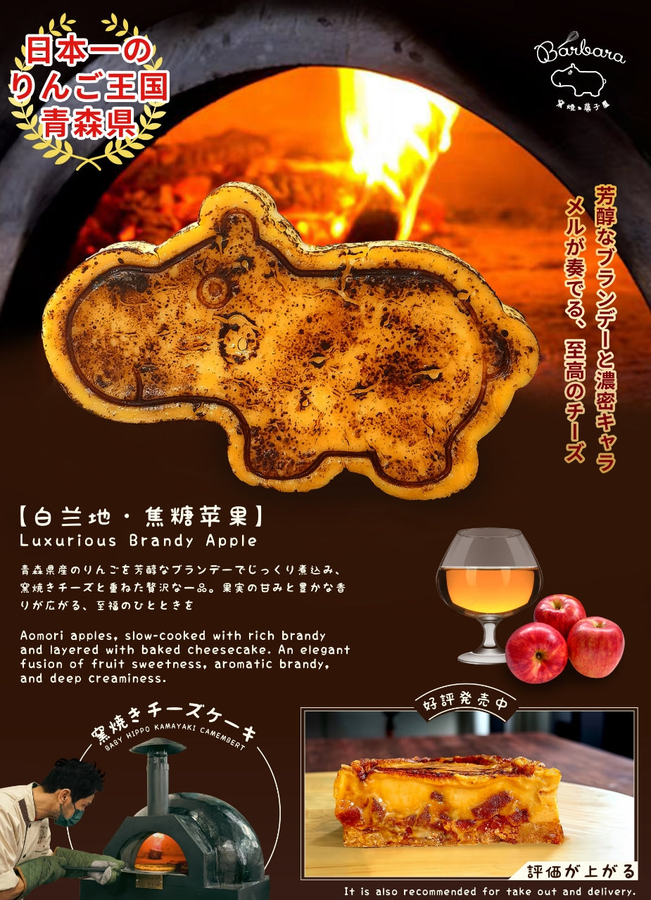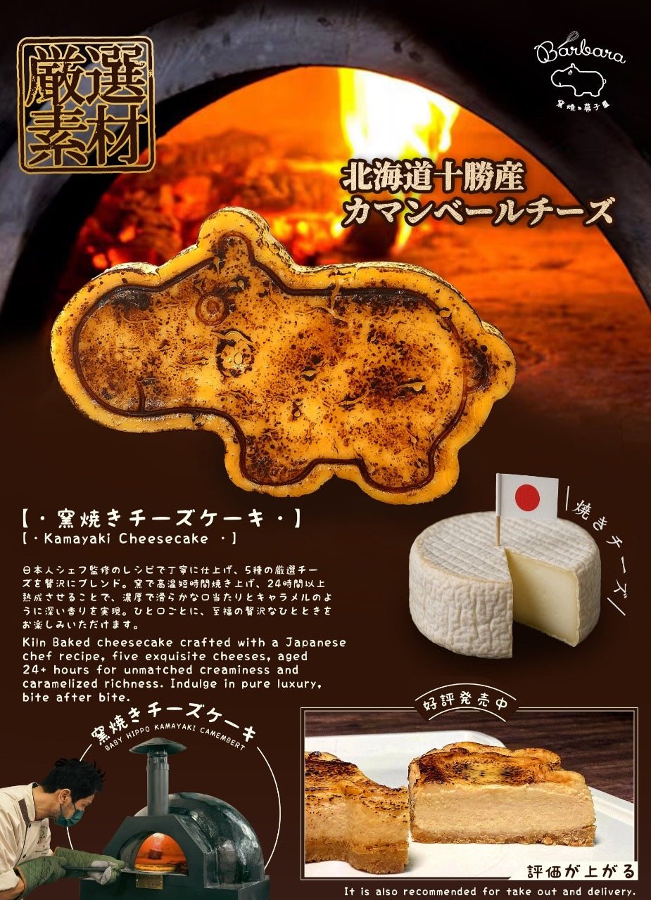窯で高温短時間焼き上げたカマンベールチーズケーキはキャラメル風味が豊かです。材料のほとんどを日本産にこだわり、数種類のチーズを使用しています。お届け前に24時間以上熟成させています。当店自慢のデザートをぜひご賞味ください。